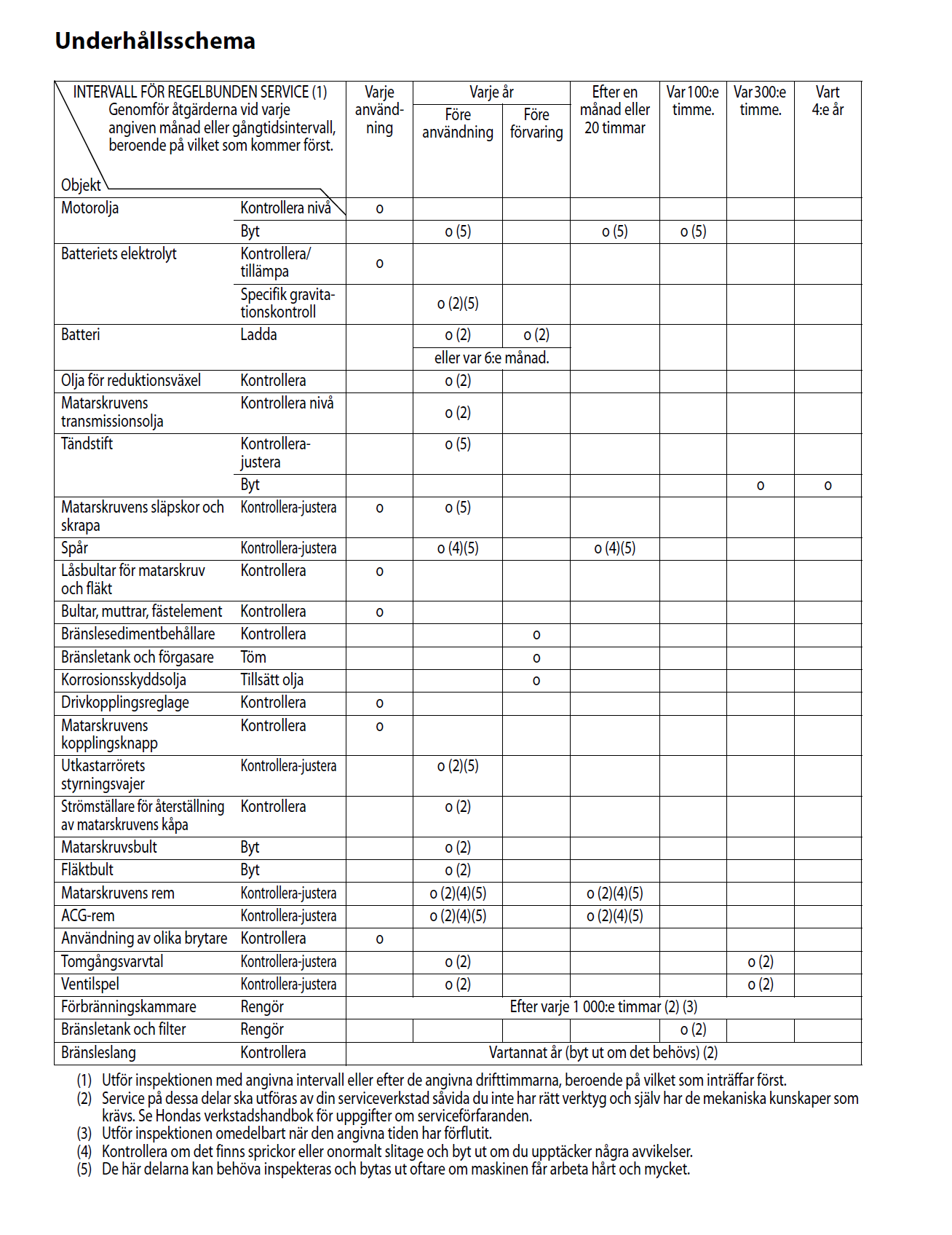 Felaktig inspektion och underhåll, felaktigt underhåll och produkter som repareras av någon annan än en servicetekniker kan orsaka produktfel som kan leda till dödsfall eller allvarliga skador. Kontakta din Honda-återförsäljare eller närmaste Honda-serviceverkstad angående underhåll som utförts av någon annan än en servicetekniker.
