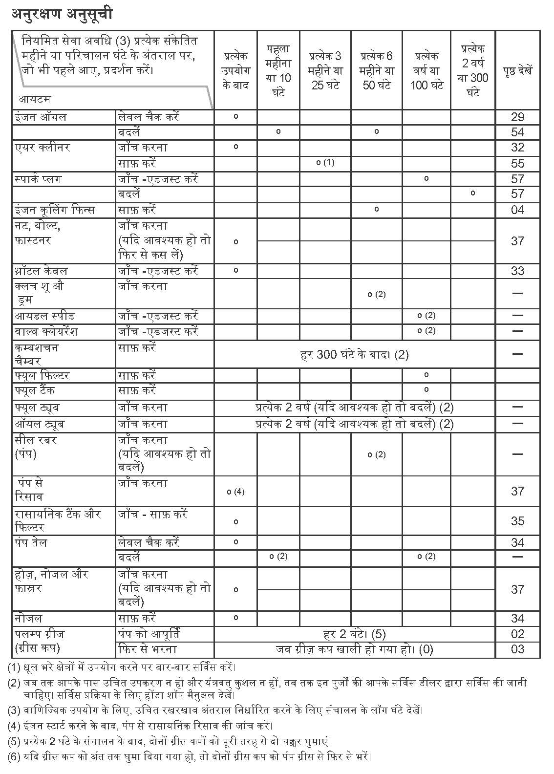गलत निरीक्षण और रखरखाव, अनुचित रखरखाव या किसी सेवा तकनीशियन के अलावा किसी अन्य व्यक्ति द्वारा बिना रिपेयर के छोड़े गए उत्पादों से उत्पाद की विफलता हो सकती है, जिसके परिणामस्वरूप मृत्यु या गंभीर चोट लग सकती है। किसी सेवा तकनीशियन के अलावा किसी अन्य व्यक्ति द्वारा रखरखाव के संबंध में अपने होंडा रिटेलर या अपने निकटतम होंडा उत्पाद डीलर या मेनटेनेंस शॉप से परामर्श करें।