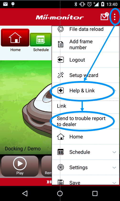 Top screen → ≡ (in the upper-right) → [Help & Link] → [Send to trouble report to dealer]