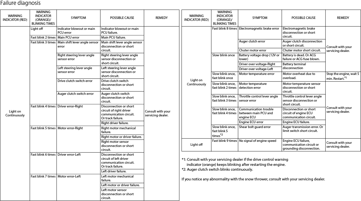 Als er tijdens gebruik een storing optreedt, geven de waarschuwingsindicator (rood) en waarschuwingsindicator (oranje) de storing of het defect in de sneeuwfrees aan.