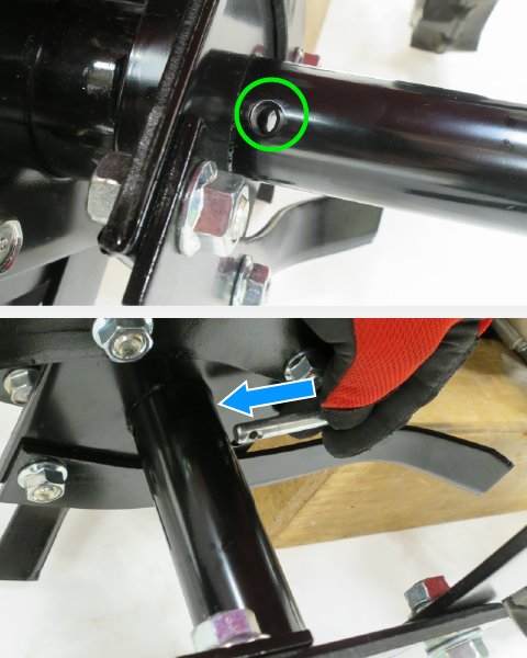 Install the wheel pin and retaining pin securely.
