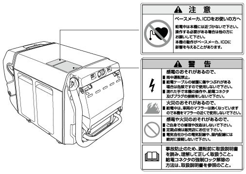 安全ラベル 本機を安全に使用していただくために、本機には安全ラベルが貼ってあります。安全ラベルをすべてお読みになってからご使用ください。 本機に貼ってあるラベルの破れ、紛失または汚れなどでラベルが読めなくなった場合は、新しいラベルに貼り替えてください。また安全ラベルが貼られている部品を交換する場合は、ラベルも新しいものに貼り替えてください。ラベルの貼り替えについては、販売元にご相談ください。